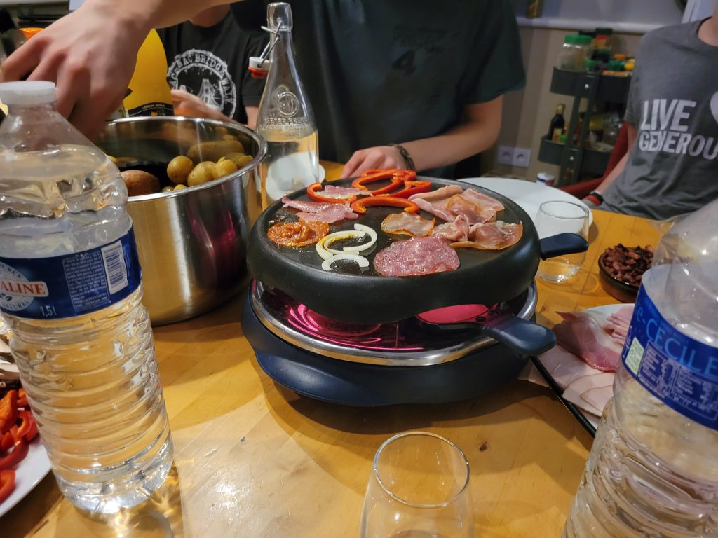 A favorite meal of ours in France is Raclette. To make it, you melt cheese in a specialized burner until it’s gooey, then slide it over baked potatoes and grilled lunchmeat and veggies. The first time we ate it, we wondered how we had managed to live so long without it.